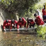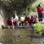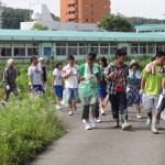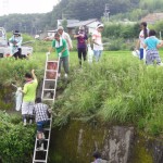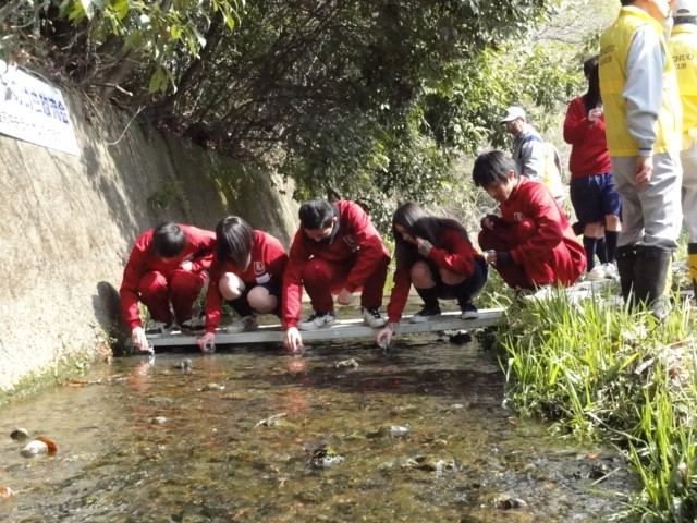 偶然!放流会現場に 三本木川清掃をよく手伝ってくれる県立日進高校の生徒さん20名程が通りかかったため、声をかけてホタル幼虫の放流を手伝っていただきました。