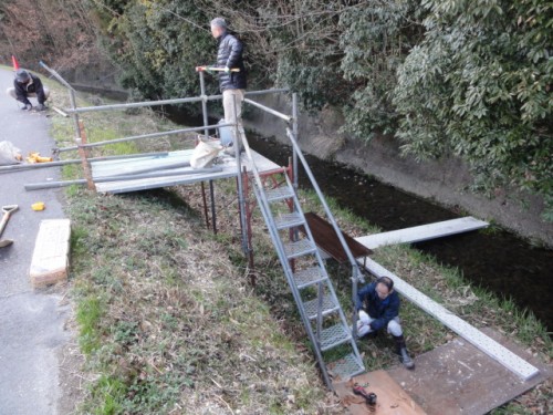 保育園児が安全に堤防から川に降りられるように、細心の注意を払い昇降用の階段を組み立てました。
