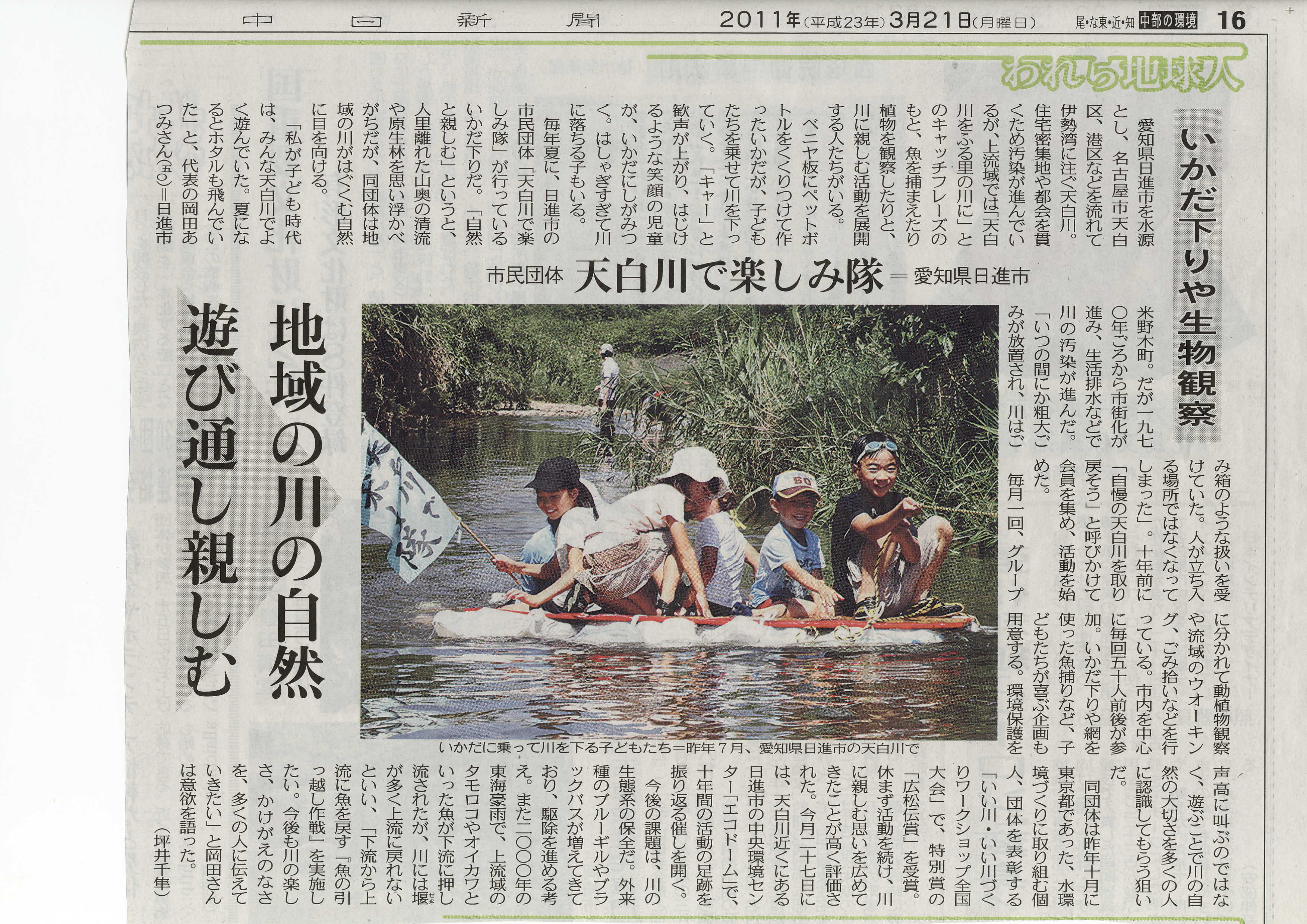 画像左:3月10日中日新聞朝刊なごや東版 画像右:放流後の集合写真  記事:環境委員会山口義則委員長